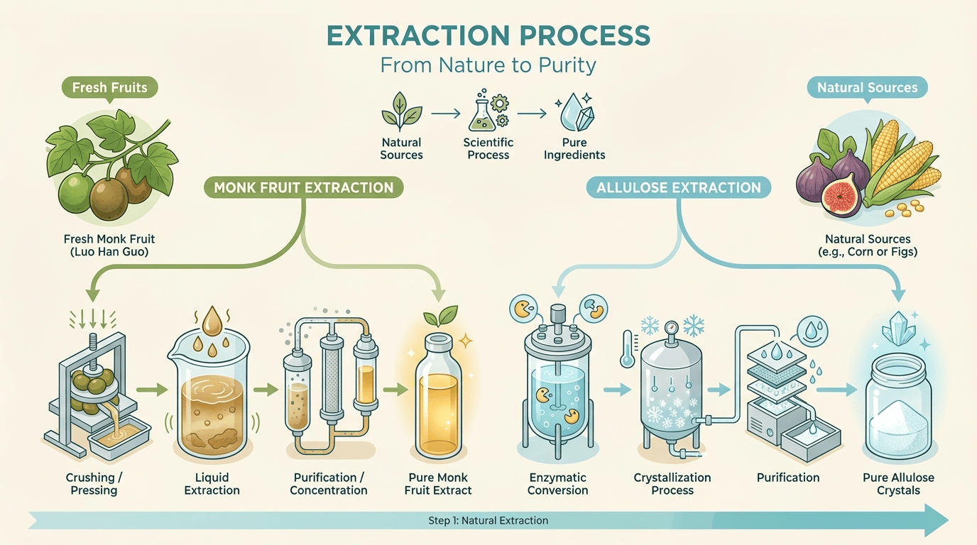 We harvest mature Monk Fruit at peak mogroside content (35-40%) and use high-purity corn starch for Allulose. Through hot water extraction and precise enzymatic conversion, we isolate Mogroside V and >98% pure Allulose, ensuring a potent, solvent-free ingredient base with zero chemical residues.